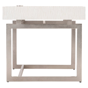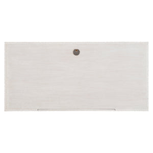 Weathered Bone finished case with cast chisel patterned front, sides and back.Metal grommet with cover on top.One drop-front drawer with finger pull and back cutout for cord management.One receptacle with two USB charging ports and two plug outlet.Shiny Nickel finish metal base with stretchers.