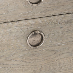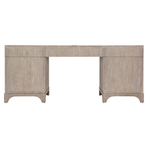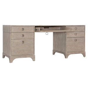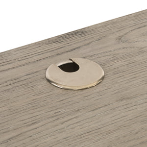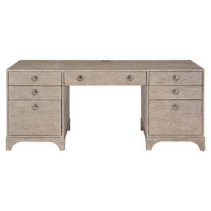 Pewter finished desk with two drawer banks for a total of seven drawers. Desk is finished on all sides.One metal covered grommet on top.One interior receptacle with two USB charging ports and two outlets.Each left and right drawer bank has three drawers - two smaller at top and one larger file drawer at bottom with removable hanging file rods for letter or legal files. The center drawer has a drop front and back cutout for cord management.Adjustable glides.