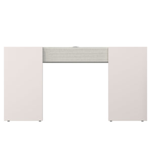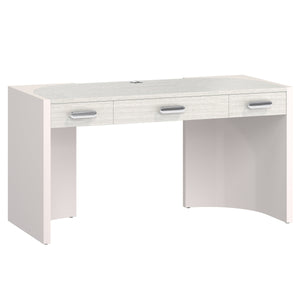 Inset wood drawer box in Mist finish with three full-extension drawersDrawer box supported by two faux stone end panels in Fossil finish that wrap around the back corners of the deskDrawer pulls in Polished Nickel finishLocated behind the right drawer is a power outlet with two USB ports and two outlets, accessible from the undersideCovered metal grommet hole at back of desk top for cord management