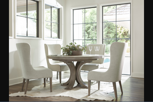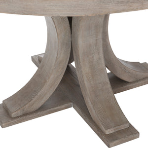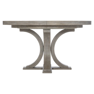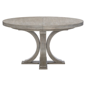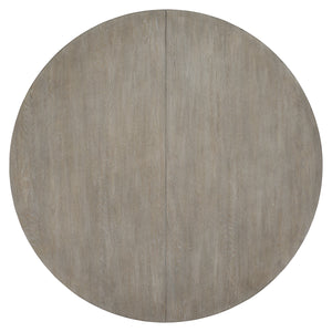 White oak solids and knotty white oak veneersPewter finish on round wood top with one 18' leafPewter finish on wood table base consisting of four curved legs and bottom wood baseAdjustable glides
