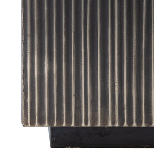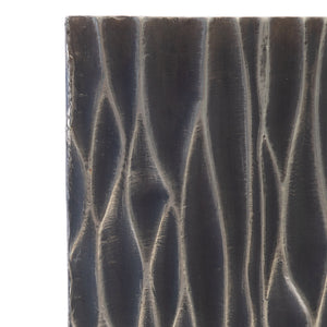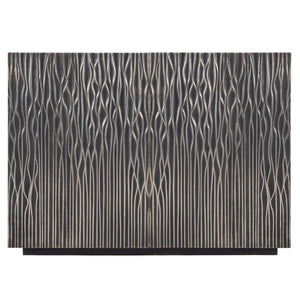 German silver wrapped case with textured/patterned doors and ends in Antique Silver finish. White painted interior.Two soft-closing doors. Behind each door is one drawer and one adjustable/removable shelf and one grommet hole with cover in back panel.Unfinished white back panel.Adjustable glides.Anti-tip kit.