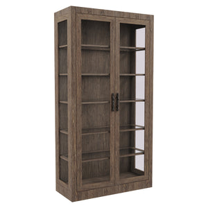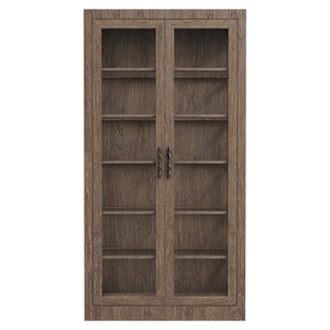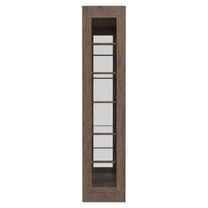 Two wood-framed doors and end panels in Playa finish, with inset tempered glassEnd panels have center mullionFive wood-framed tempered glass shelves with polished edges and wood bottom surfaceCenter shelf is fixed, while other four glass shelves are adjustable/removableTwo halogen puck lights with touch dimmer switch on right-side facing hinge
