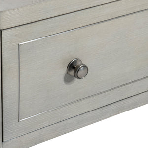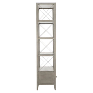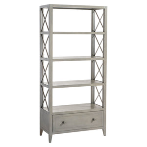 Ash wood in Nebbia finish and exposed metal in Brushed Stainless Steel finishFour open, fixed shelves connected by four open, metal "X"-frames on both endsMetal inlay in Brushed Stainless Steel finish on one pull-to-open, soft-close drawer with metal pulls in Glazed Stainless Steel finishAdjustable glidesAnti-tip kit