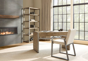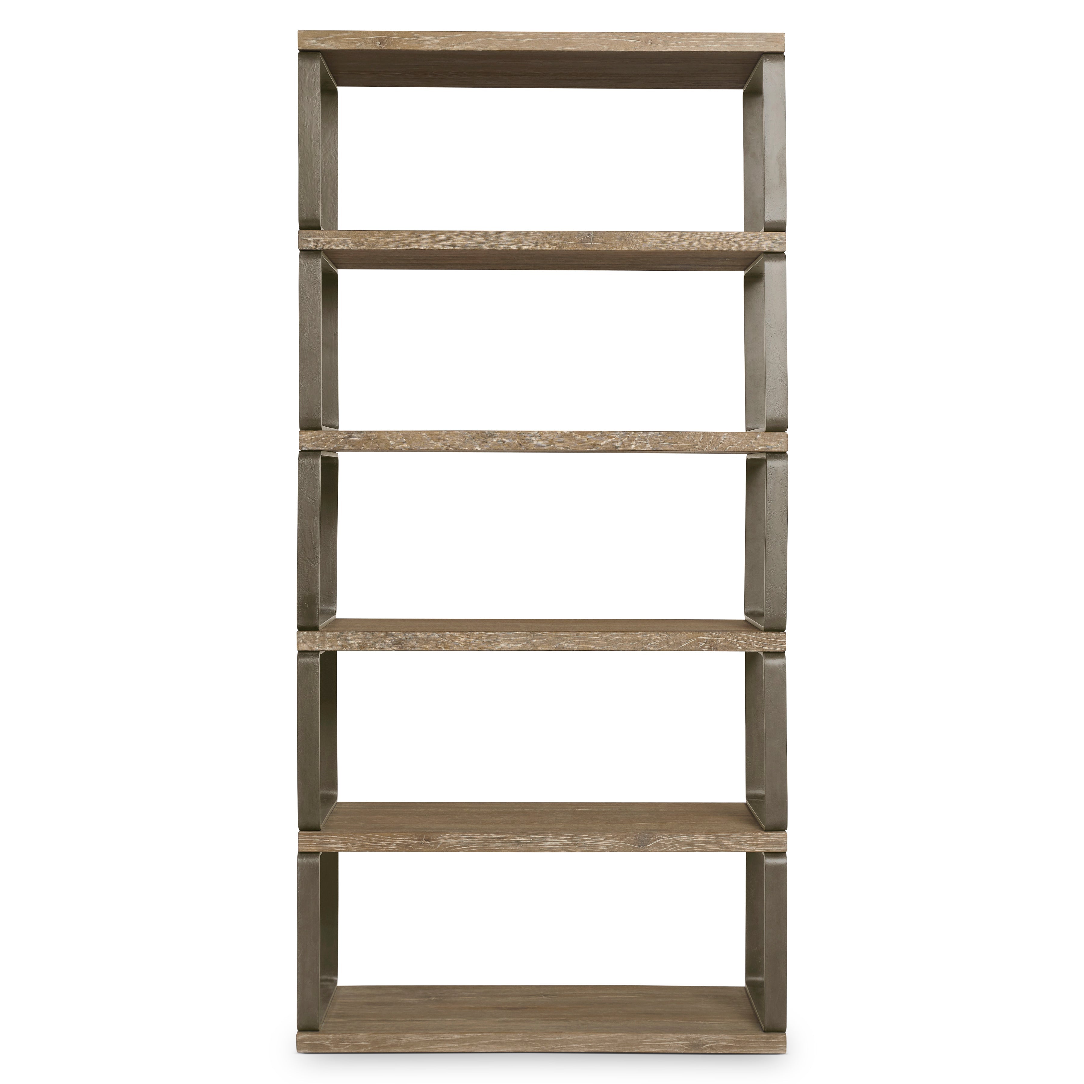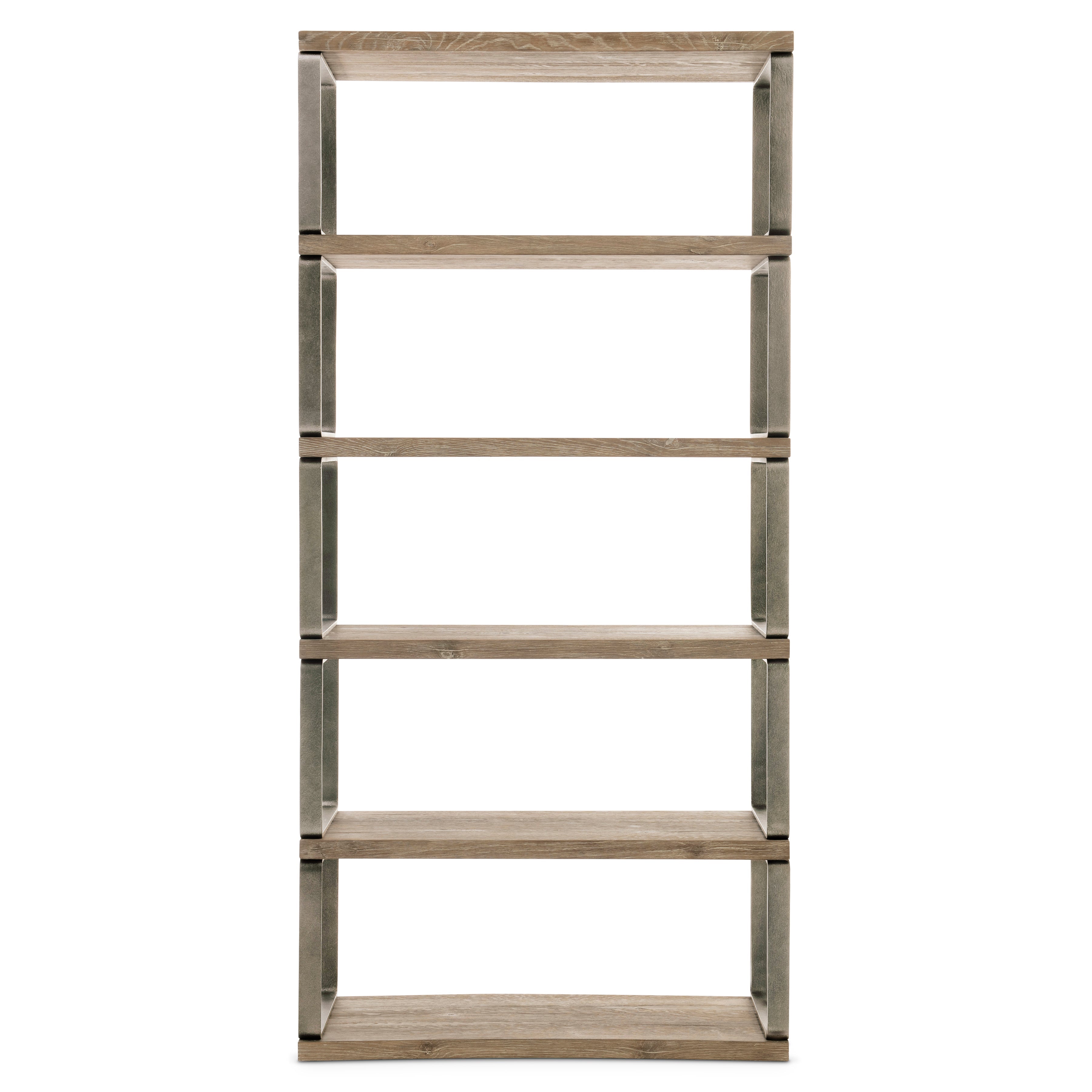 White oak solids and veneers in Aurum finish with applied texture steel frame supports in Barlow finishFive fixed shelvesAdjustable glidesAnti-tip kitNatural characteristics in the wood are a normal part of the Aurum finish and make each piece unique