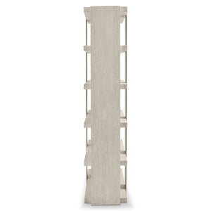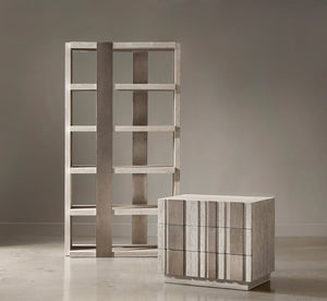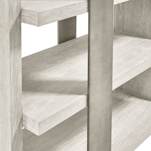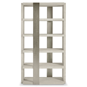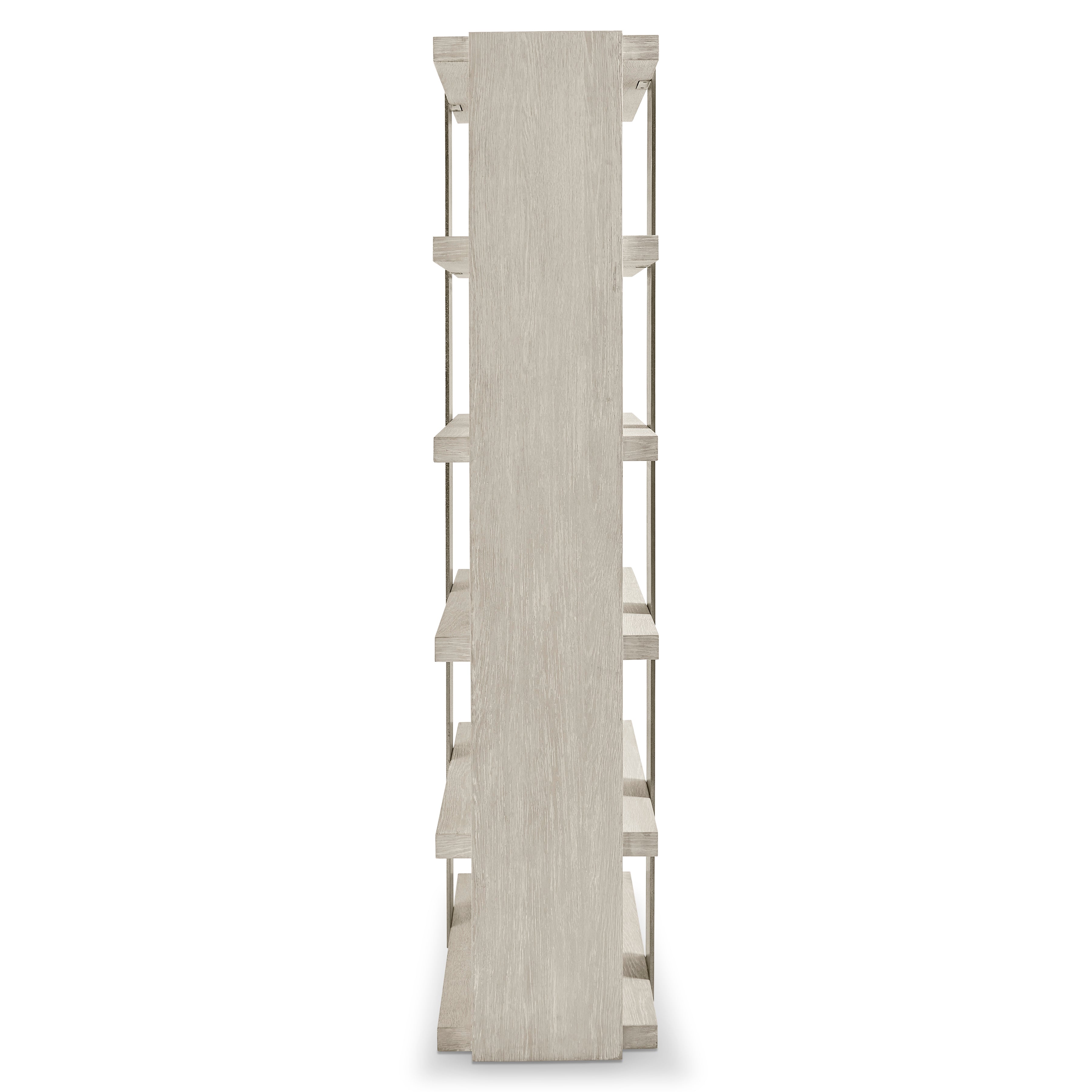 Wirebrushed oak in Larza finish with sandblasted aluminum posts in Satin Nickel finish in front and backFive fixed shelvesAdjustable glidesSpecifications subject to change without notice