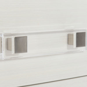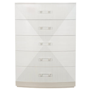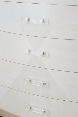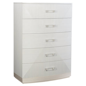 Poplar solids and engineered faux anigre veneers.Linear White finish on case and fancy face drawer fronts. Linear Gray finish on bottom case border and plinth base.Five drawers.Adjustable glides.Anti-tip kit.