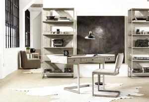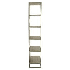 Tubular Steel frame in Glazed Silver finish.Planked wood top and five shelves in Morel finish.Back panel consists of both open areas and planked solids in Morel finish.Adjustable glides.Anti-tip kit.
