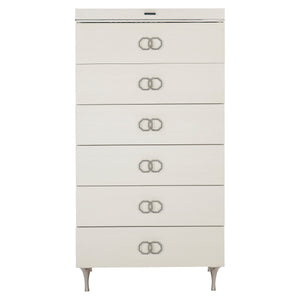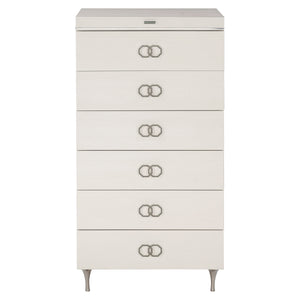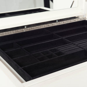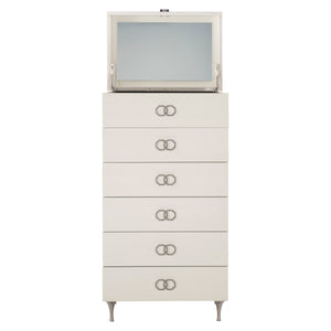 Eggshell finishPolished stainless steel bead around topSix soft-closing drawersLift-up mirrored lid reveals a black felt-lined jewelry trayPolished stainless steel feet