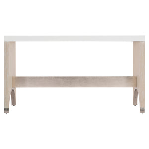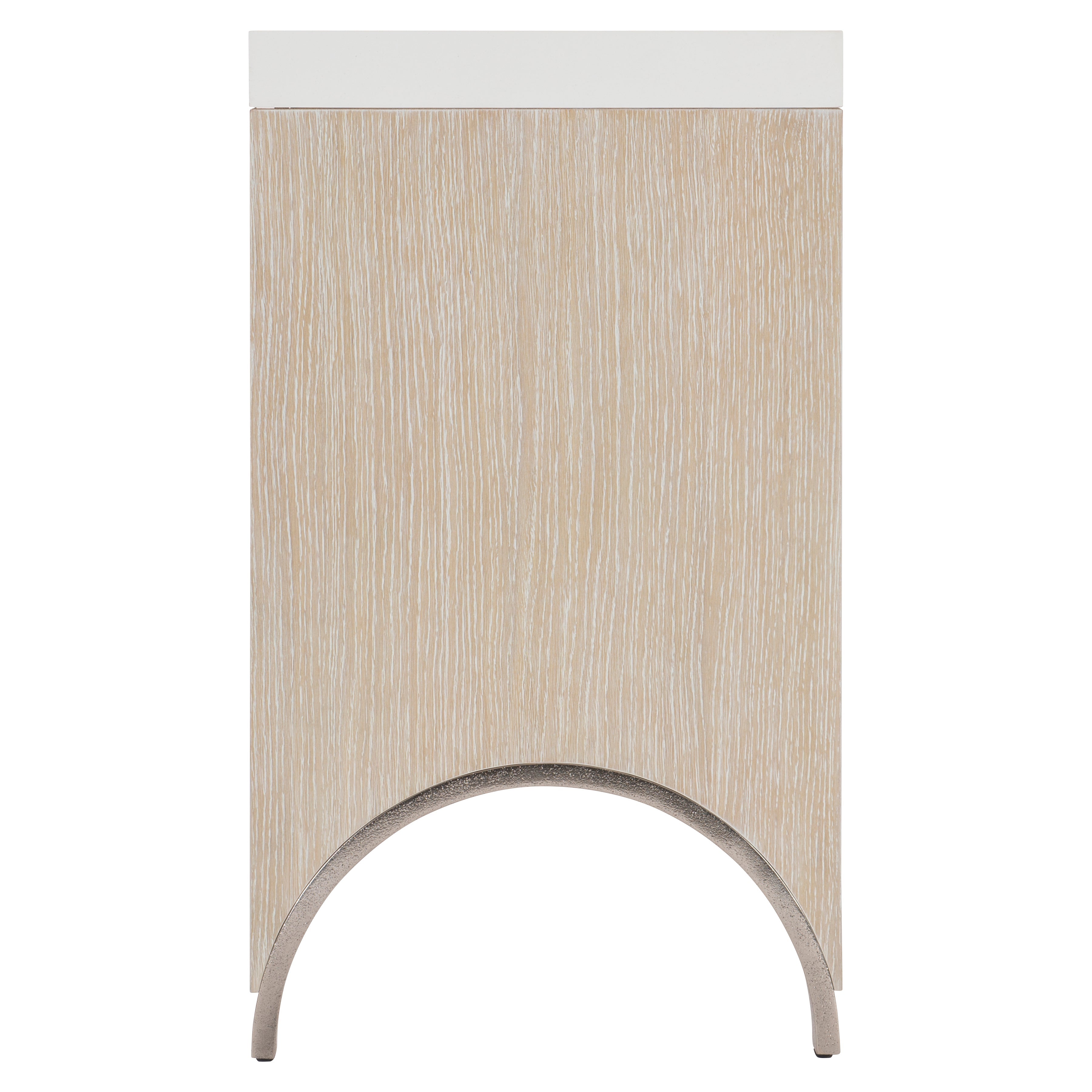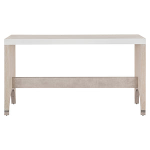 Quartered ash solids and quartered white oak veneersFossil finish on cast faux stone topDune finish on wood frame with arched end panelsShiny Nickel finish on cast aluminum center stretcher and arched end panel baseAdjustable glides
