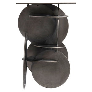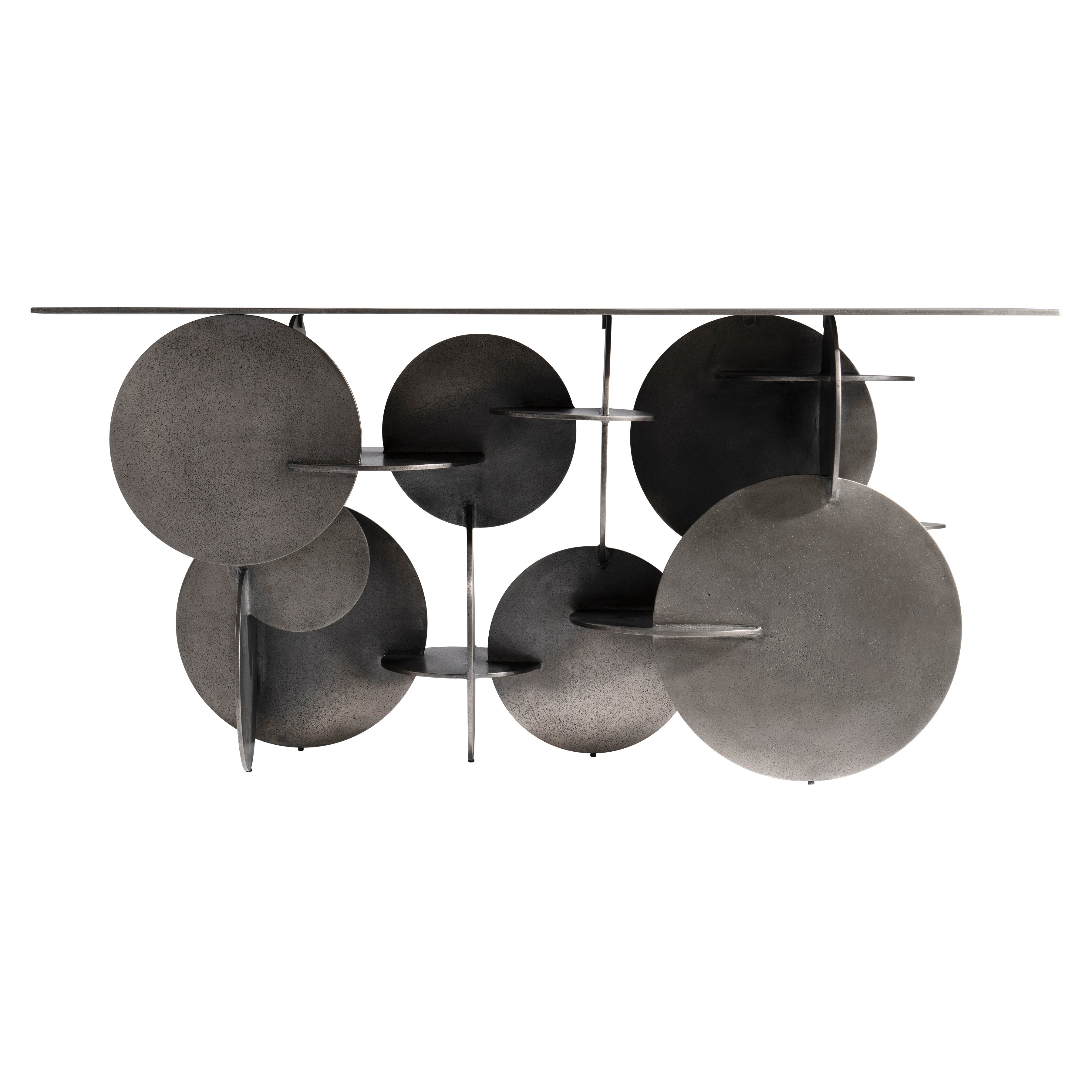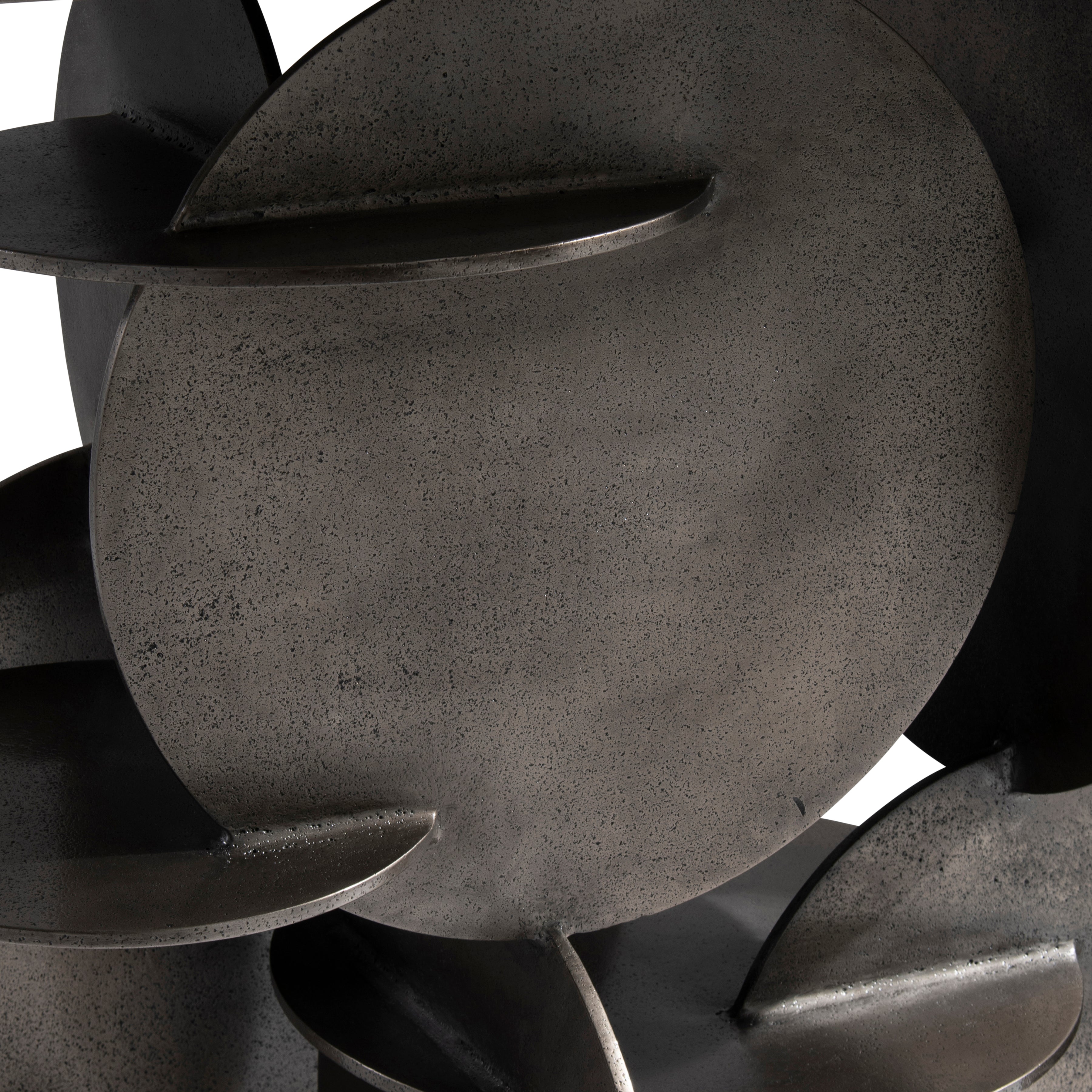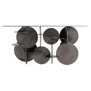 Rectangular topBase made of varied sizes of intersecting vertical and horizontal flat disksCast aluminum in Graphite finishAdjustable glides