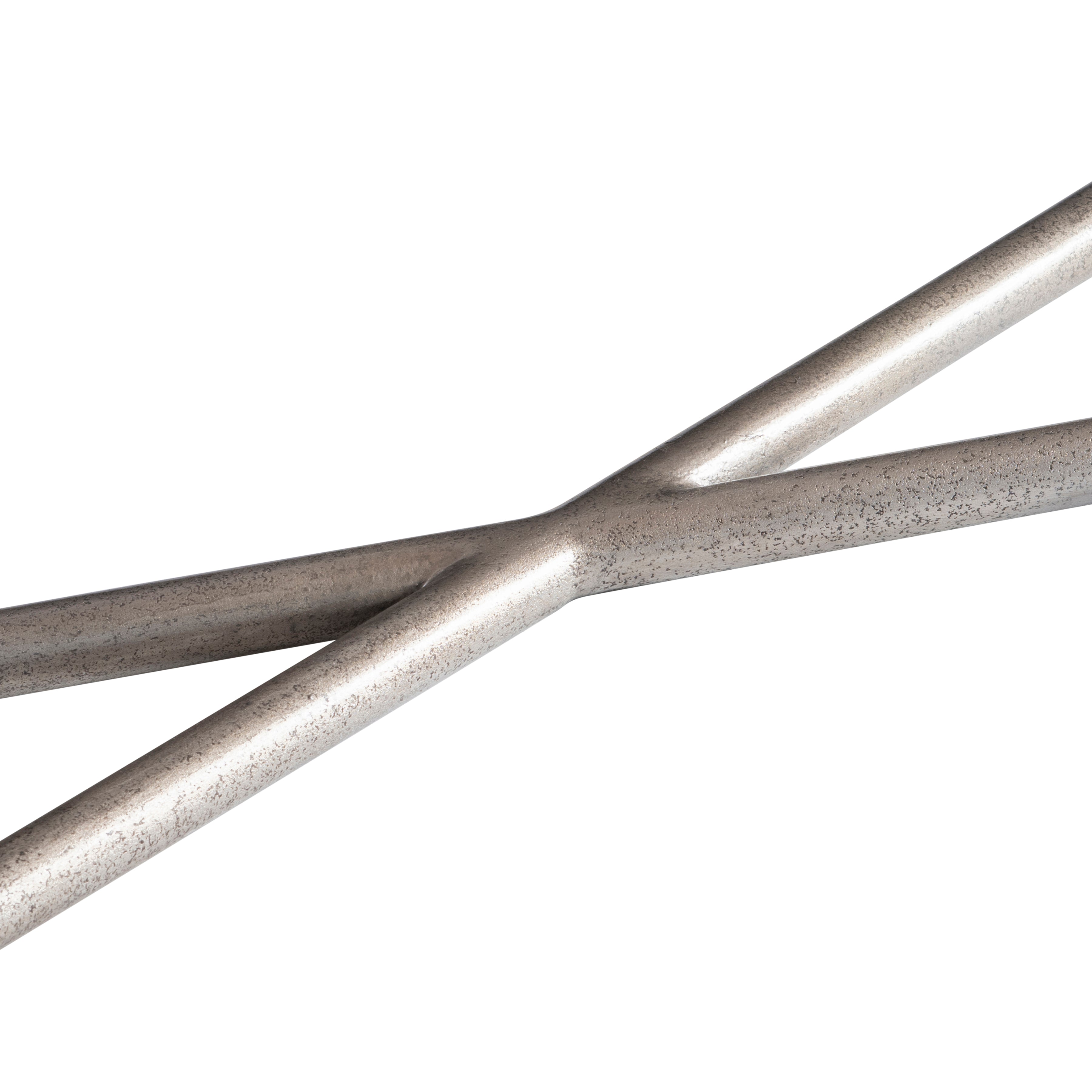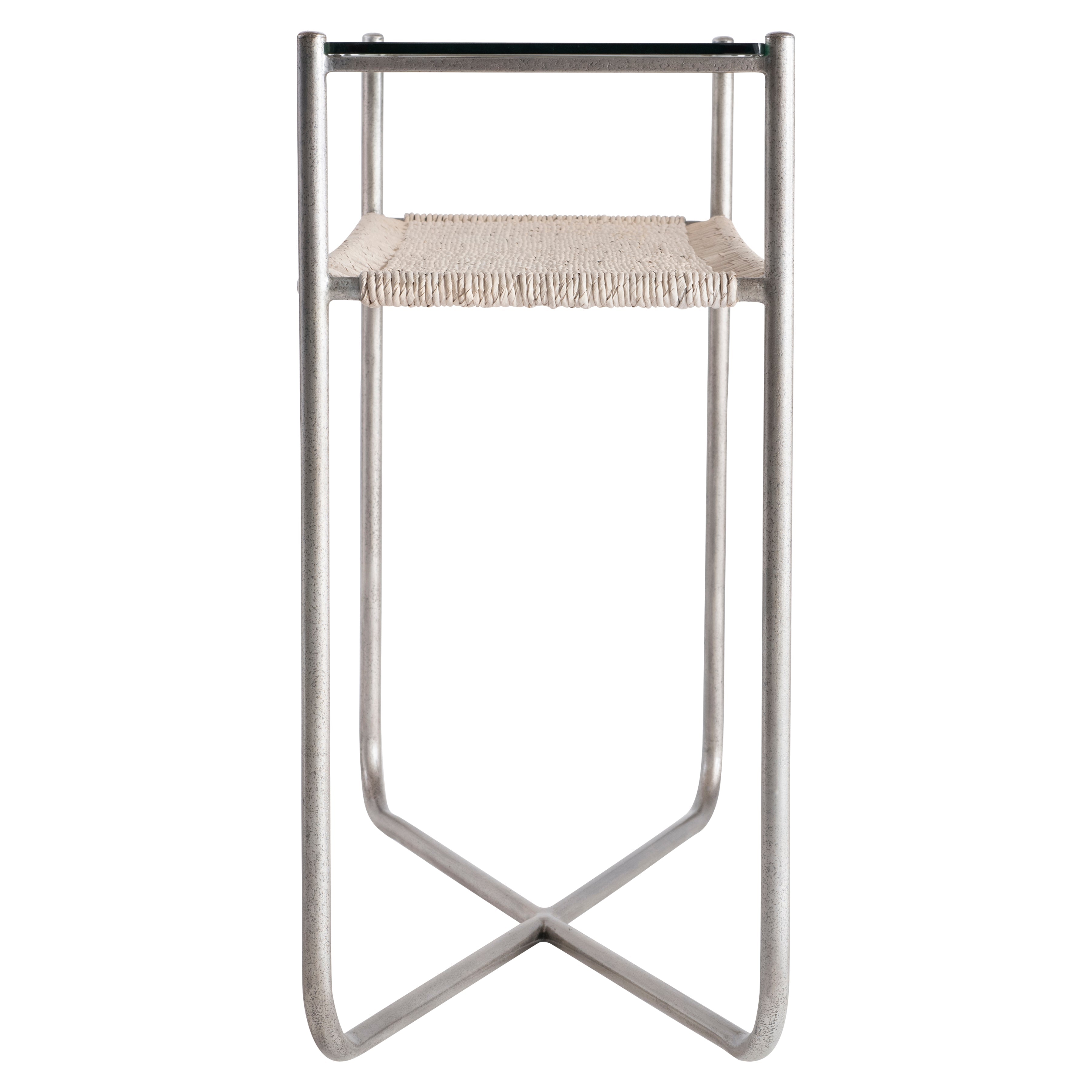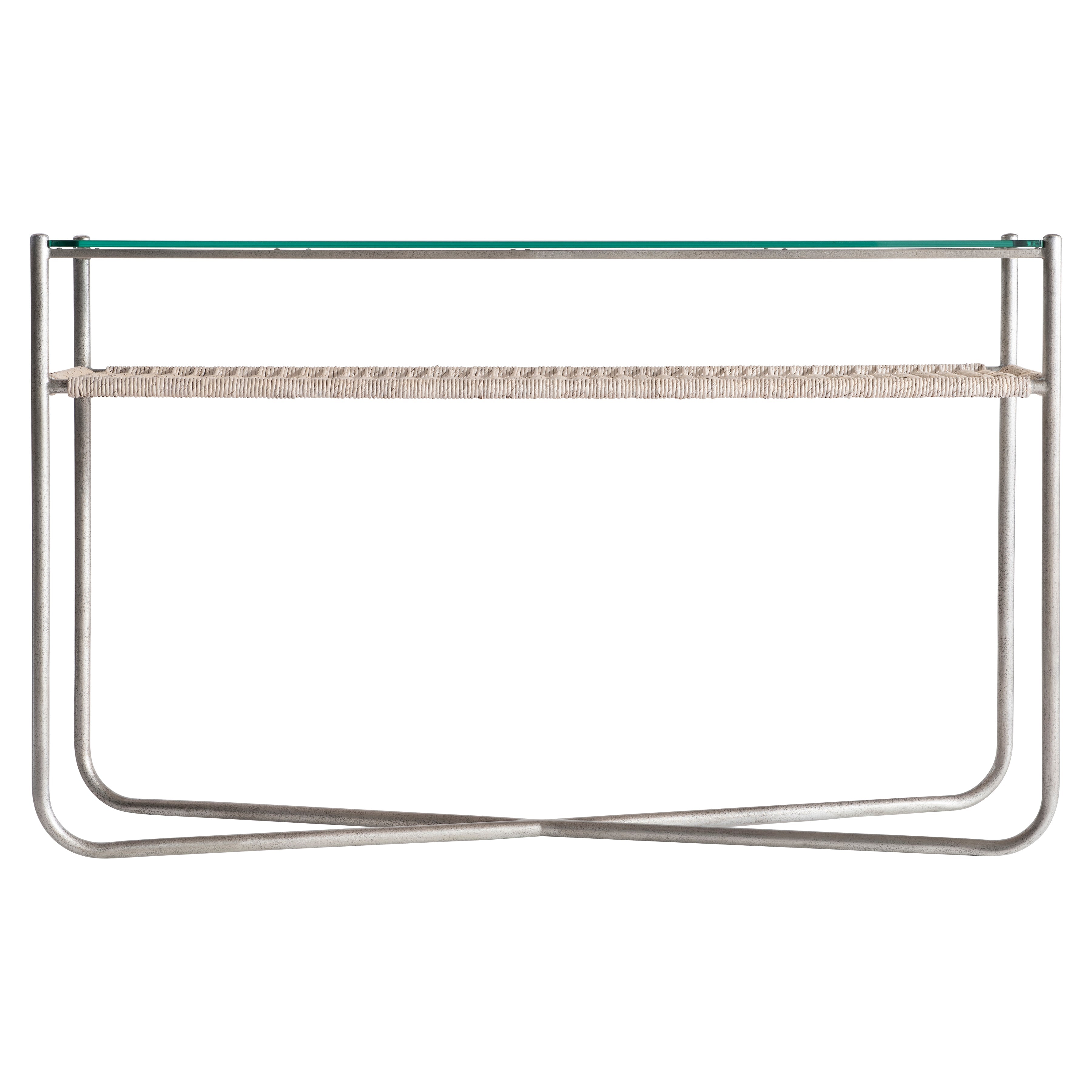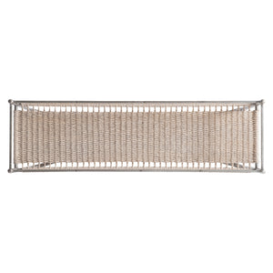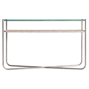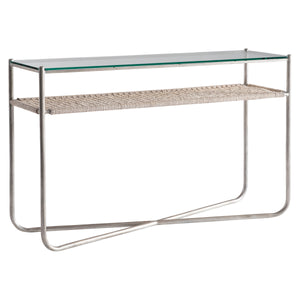 Steel frame in Graphite finish with woven abaca shelf in Light Grey Wash finish and a tempered glass top"X"-shaped bottom stretchersAdjustable glidesNot suitable for use with TVSpecifications subject to change without notice