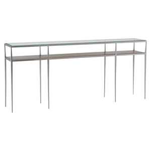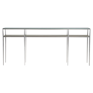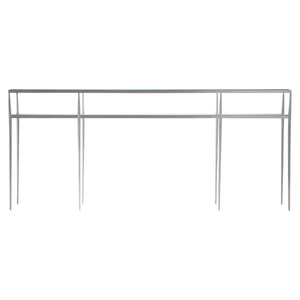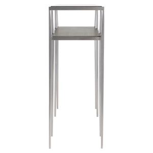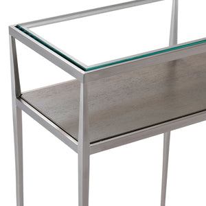 Metal frame in Brushed Stainless Steel finish with tempered, polished-edge glass top and one wood shelf in Nebbia finishAdjustable glidesNot suitable for use with TVSpecifications subject to change without notice