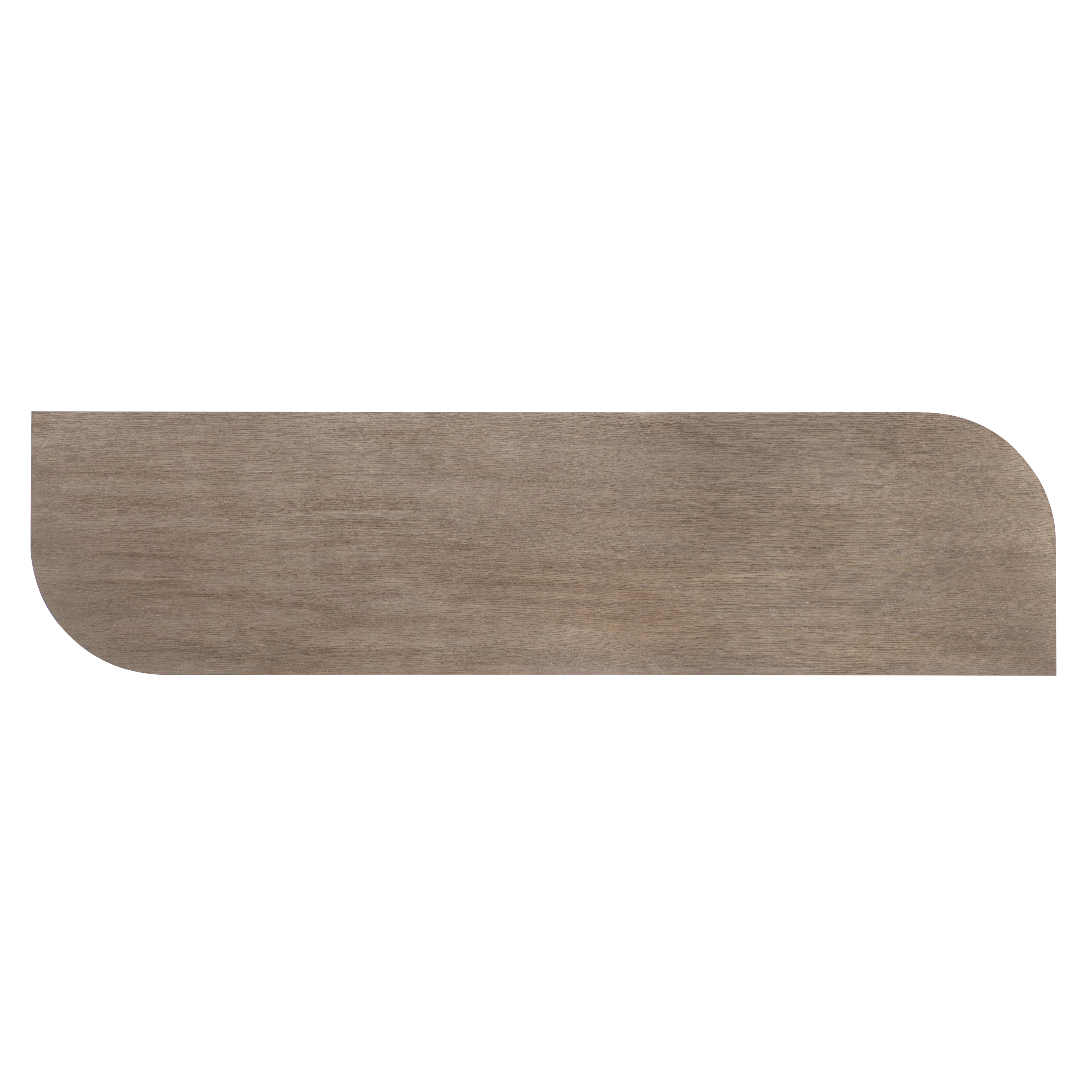 Oak table top in Weathered Greige finish, framed by polished stainless steel in Light Bronze finish and supported by two round polished stainless steel pedestals in Dark Bronze finishAdjustable glidesNot suitable for use with TV