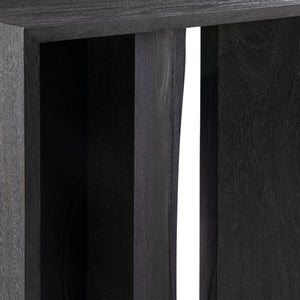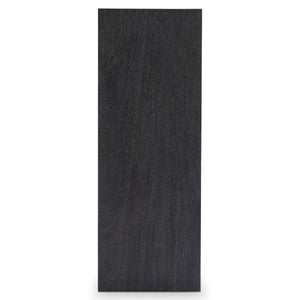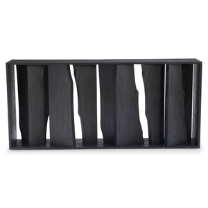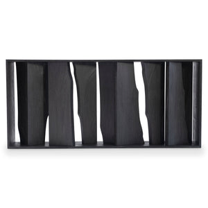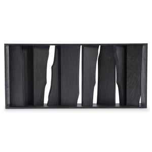 Suar wood in Flint Grey finishNine organic-shaped solid wood uprightsAdjustable glidesNot suitable for use with TVSpecifications subject to change without notice