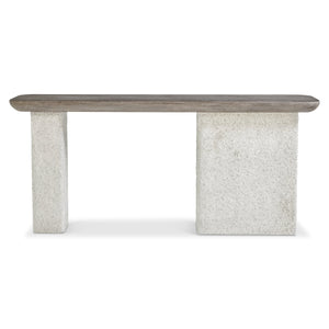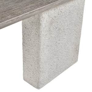 Wirebrushed oak top in Puma finish supported by textured faux stone base pedestals in Millstone finishAdjustable glidesSpecifications subject to change without notice