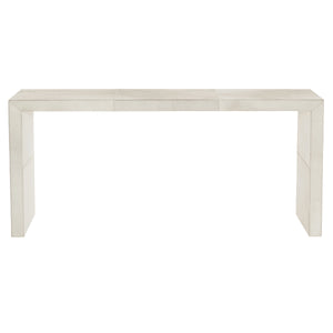 Rectangular console table.White hair-on-hide wrapped console with white saddle stitching.Adjustable glides.Note: For safety, an anti-tipping kit is included with instruction sheet.