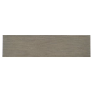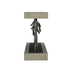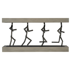 Rectangular console table.Wire-brushed top and base of quartered white oak veneers.Cerused Greige finish.Solid cast iron figures in Black finish