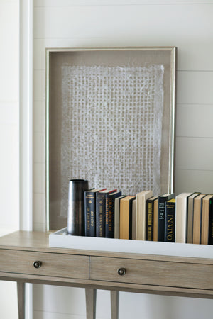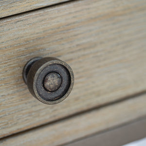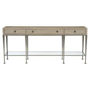 Three drawers.Stainless Steel base with eight legs in Vintage Nickel finish.One inset tempered bottom glass shelf.Adjustable glides.Anti-tip kit.