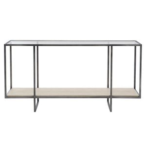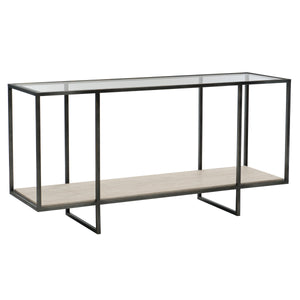 Inset tempered glass top with beveled edge.Tubular steel frame and stretchers in oil-rubbed Bronze finish.White travertine stone shelf.Adjustable glides.