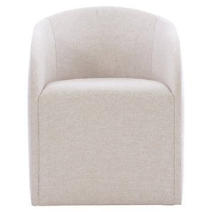 Fully upholstered dining chair.Curved back.Neutral fabric.Non-marring heavy duty casters.
