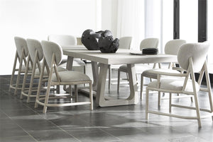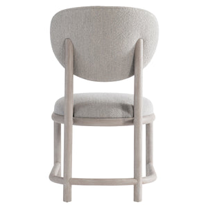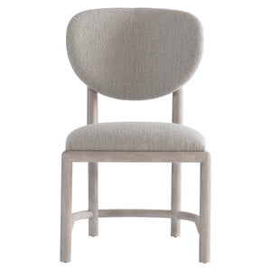 Side chair with upholstered slightly curved oval back and upholstered seat.Neutral fabric.Gris finish on exposed wood frame with stretchers and angled back posts.Glides.