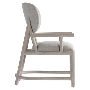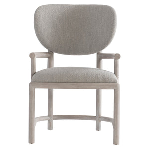 Arm chair with upholstered curved oval back and upholstered seat.Neutral fabric.Exposed wood frame with angled back posts and stretchers in Gris finish.Glides.