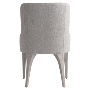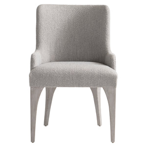 Upholstered arm chair.Neutral fabric.Exposed wood legs in Gris finish.Glides.