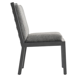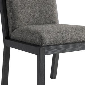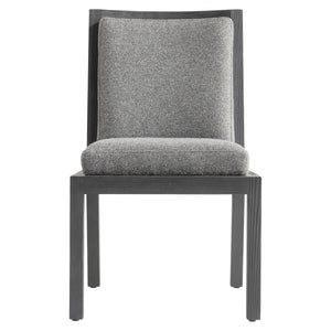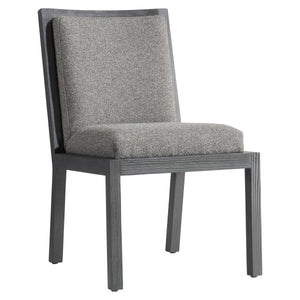 L'Ombre finish on exposed wood frame ladderback side chair with upholstered back and seat with stitching.Upholstered back is visible through ladderback slats.Dark fabric.Glides.