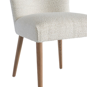 Side chair with upholstered seat and curved back.Neutral fabric.Exposed wood legs.Sahara finish.