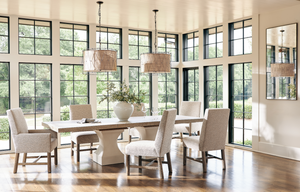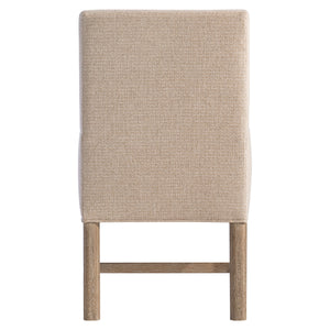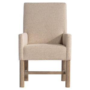 Exposed wood legs and stretchers in Marcona finishFully upholstered arms, back and seat, with welt trim around bottom of seatFabric: B645Glides
