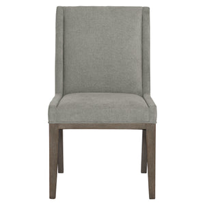 Solid Ash.Cerused Charcoal finish.Upholstered seat and half back (inside and outside) with no welt or nailhead trim.Neutral fabric.