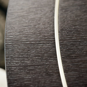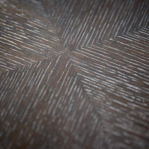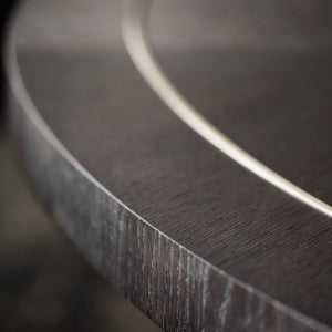 Rectangular wooden dining table.Ash solids and Quartered White Oak veneers.Cerused Mink finish.Fancy face top with Stainless Steel inlaid border in Silver Mist finish.