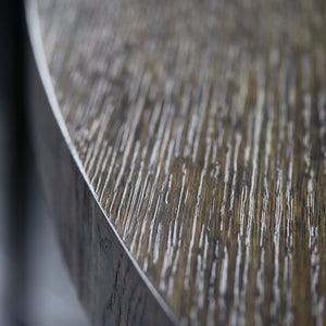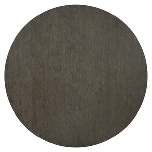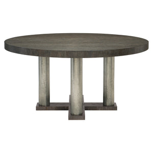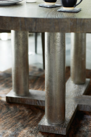 Round dining table.Top in Cerused Charcoal finish.Four cast aluminum posts in Textured Graphite finish with a cross shaped wood base in Cerused Charcoal finish.Adjustable glides.