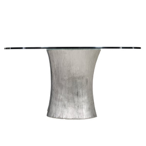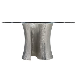 60 inch - Round dining table.Clear glass top with eased edge.Serpentine shaped cast aluminum base in Bright Nickel finish.Adjustable glides