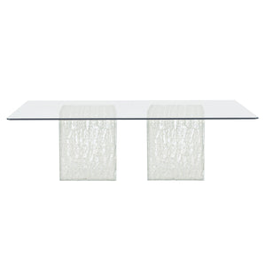 Rectangular dining table.Clear glass top with clipped corners and eased edges.Acrylic base with cast wood grain pattern.Note: No glides or bumpers on bottom of base.
