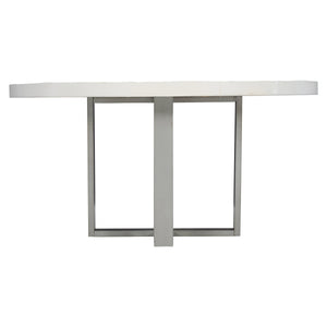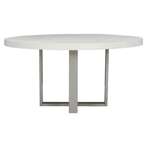 Round dining table.Cast concrete top in Bone finish with inserts to attach metal base.Tubular steel base in Gray Mist finish.Adjustable glides.