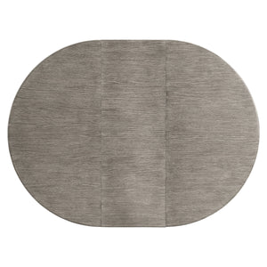 Textured faux stone round pedestal base in Millstone finish, supporting wirebrushed oak round top in Puma finishAddition of one 20" leaf converts round top to ovalAdjustable glidesSpecifications subject to change without notice