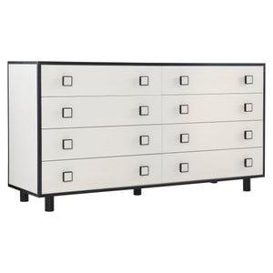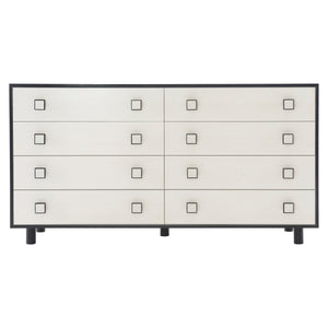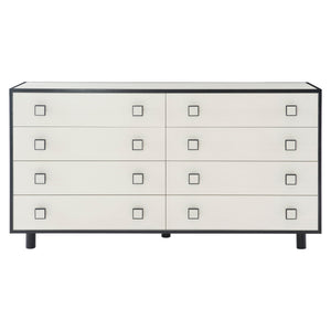 Two-tone finish - Case in Eggshell finish, and borders and feet in Onyx finishEight soft-closing drawers with two-tone finish on wood knobsAdjustable glidesAnti-tip kitNot designed to support TV &/or other media