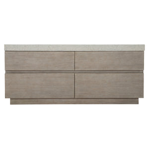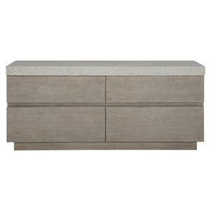 Flint finish on oak case. Sand Grey finish on cast concrete top with smooth top and rough textured sides.Four soft-close drawers with finger pull. Bernhardt name plate in top left drawer.Plinth base.Adjustable glides.Anti-tip kit.