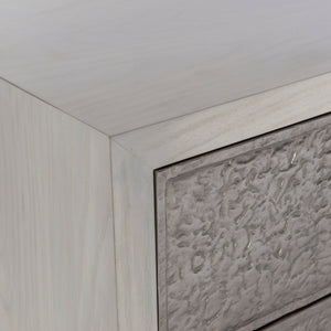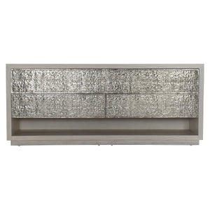 Pika finish with four push-to-open drawers with textured fronts of cast aluminum.Bernhardt name plate in top left drawer.Open front compartment at bottom of case.Plinth base.Adjustable glides and anti-tip kit with instruction sheet.