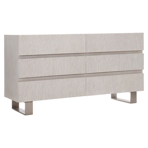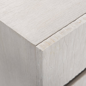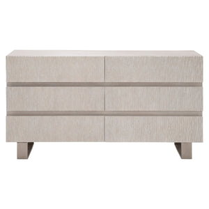 Quartered ash solids and quartered white oak veneersWeathered Bone finish on caseShiny Nickel finish on cast aluminum legsSix drawers and chisel patterned cast resin fontsDrawers open by finger pull