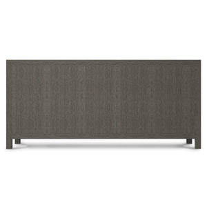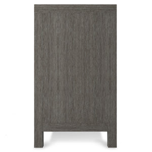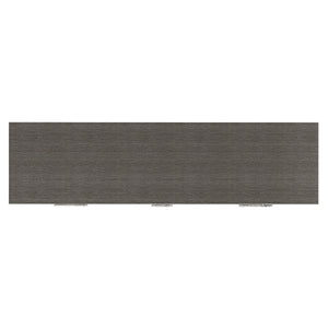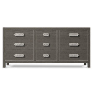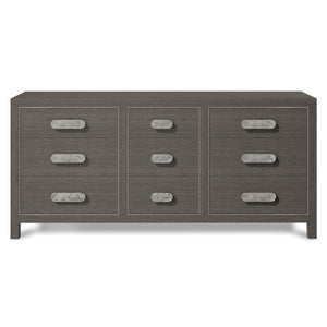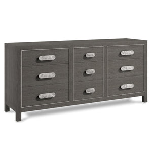 Ash wood veneers and quartered oak veneer in Porcini finishNine soft-close drawers: six wider drawers on left and right and three narrow drawers in the centerTextured metal drawer pulls and inset metal frame around each of three drawer banks in Bright Graphite finishFour legs and two center support legs in Porcini finishAdjustable glides & Anti-tip kit