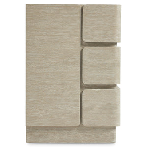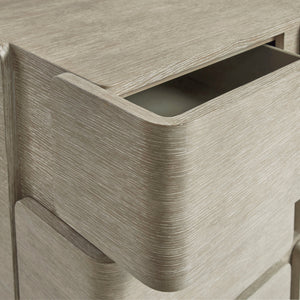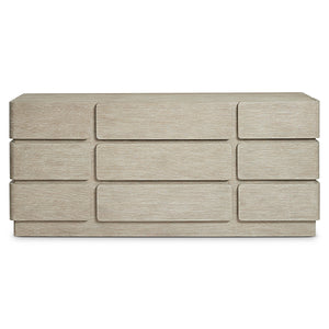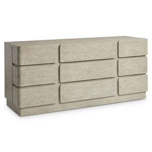 Quartered white oak solids and veneers in Clay finishSix wrap-around, soft-close drawers with fingerpulls, three on either side of center drawersThree center flat-front, soft-close drawers with fingerpullsPlinth baseAdjustable glides