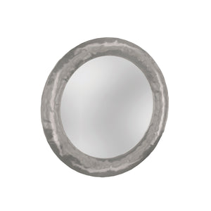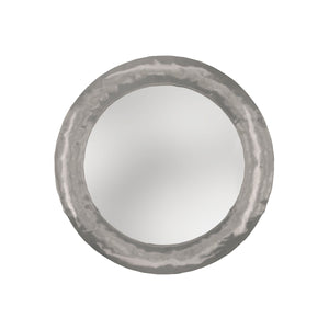 Round cast aluminum frame with hammered textureBright Graphite finishNon-beveled mirrored glassHangers included