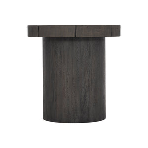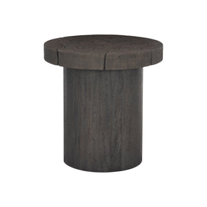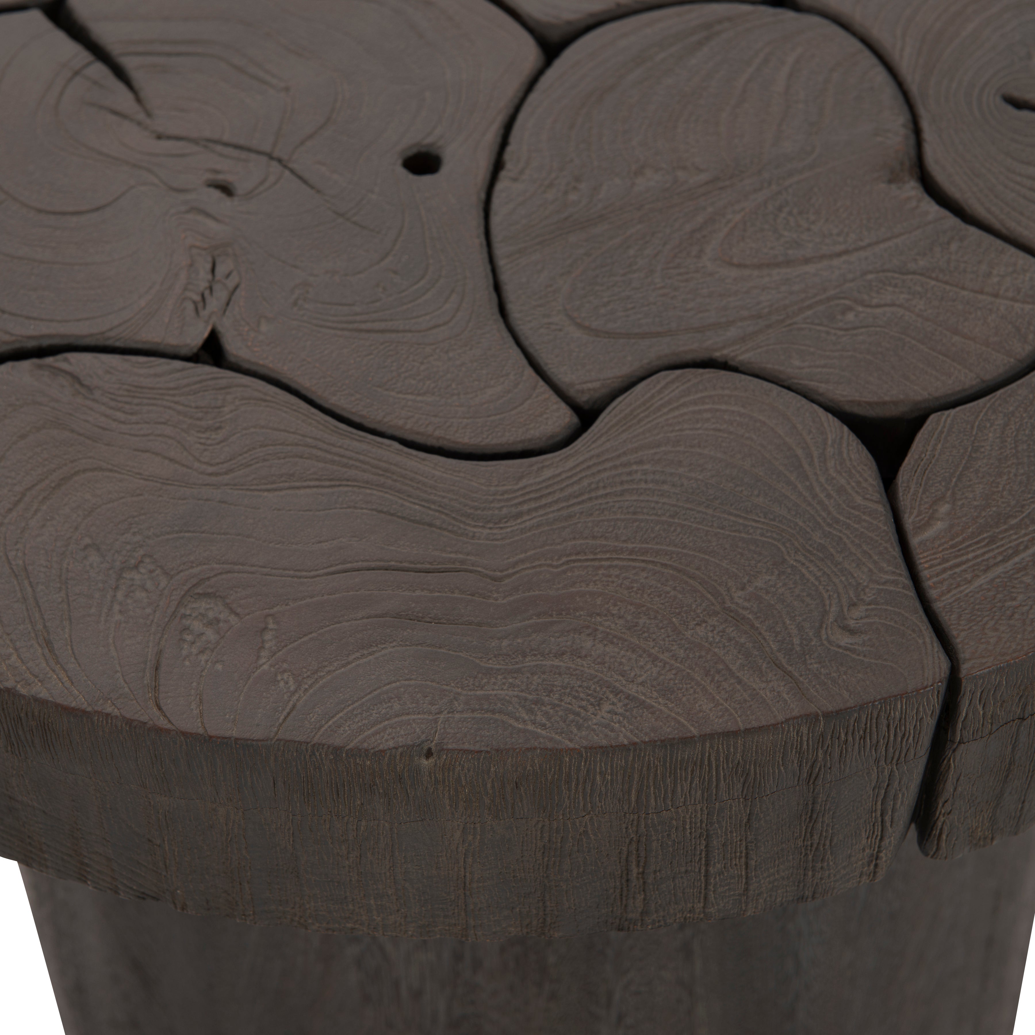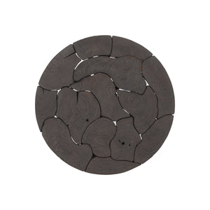 Round sliced teak top.Round suar wood base.Smoked Truffle finish.Adjustable glides.