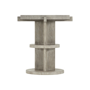 Top and pedestal base in Light Shale finishPedestal has a center shelf and bottom base shelf surfaceAdjustable glides