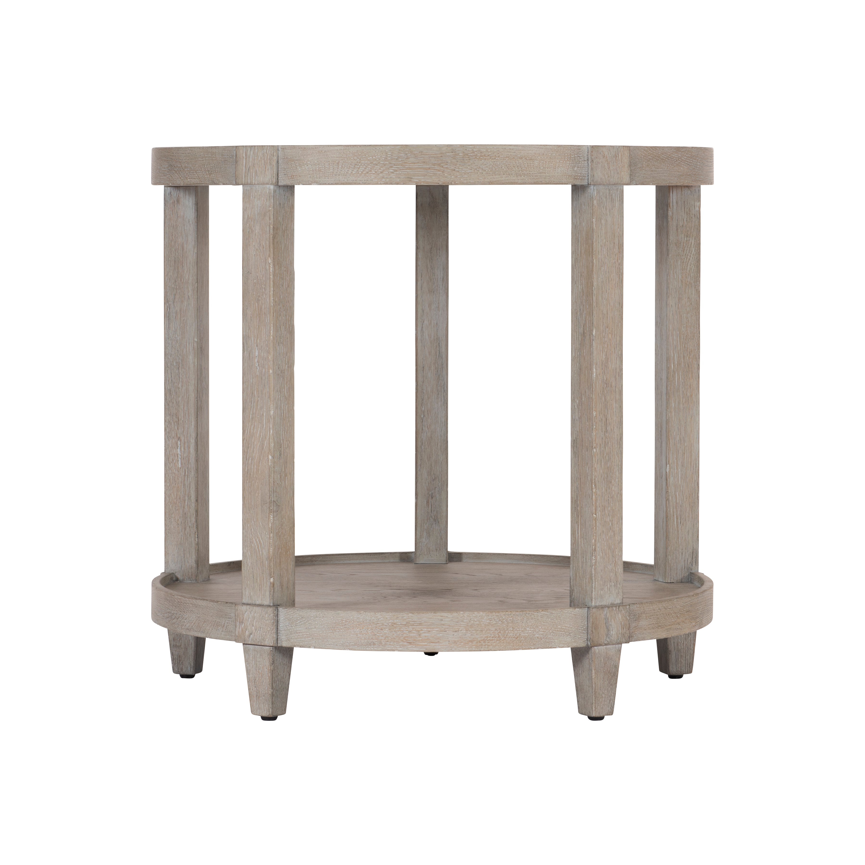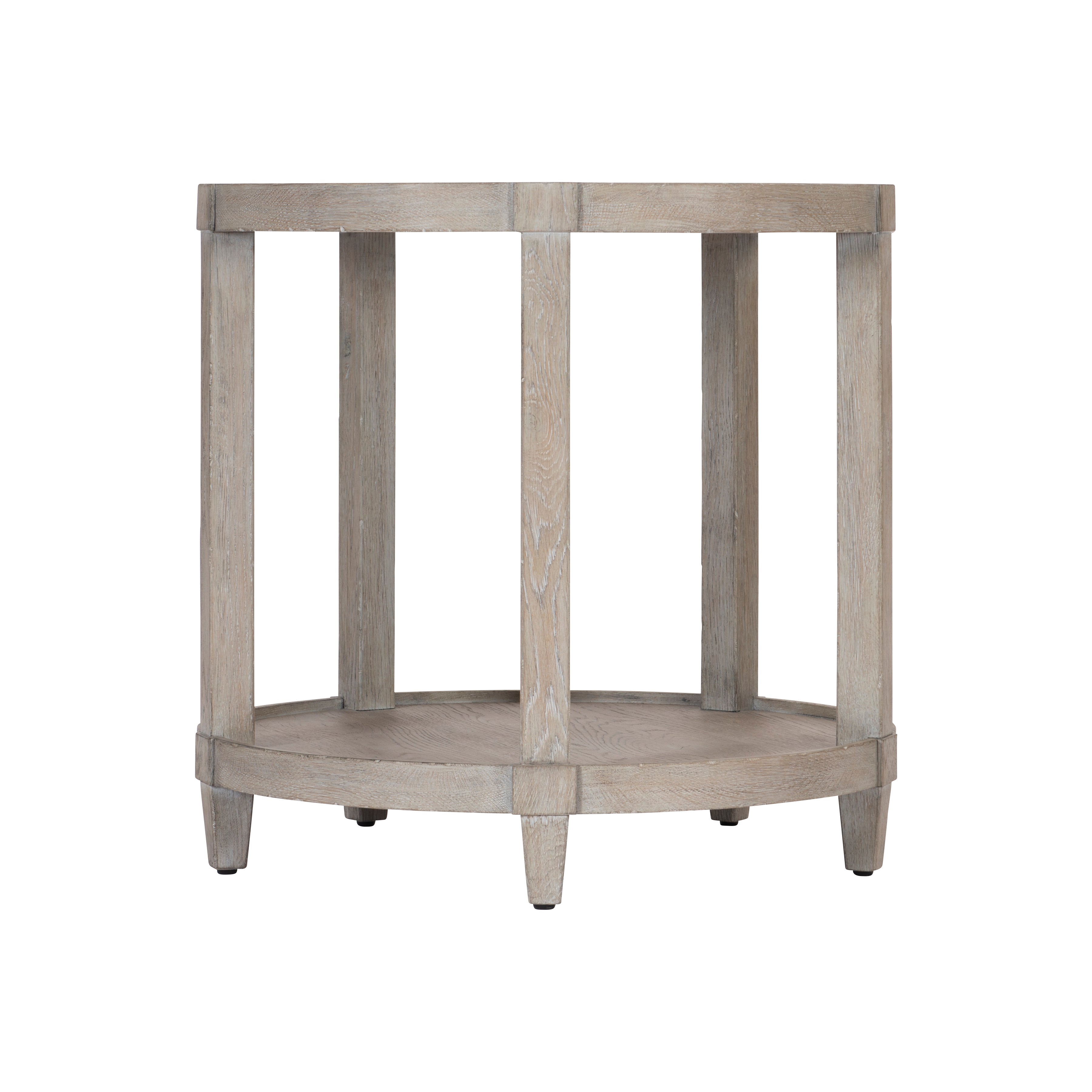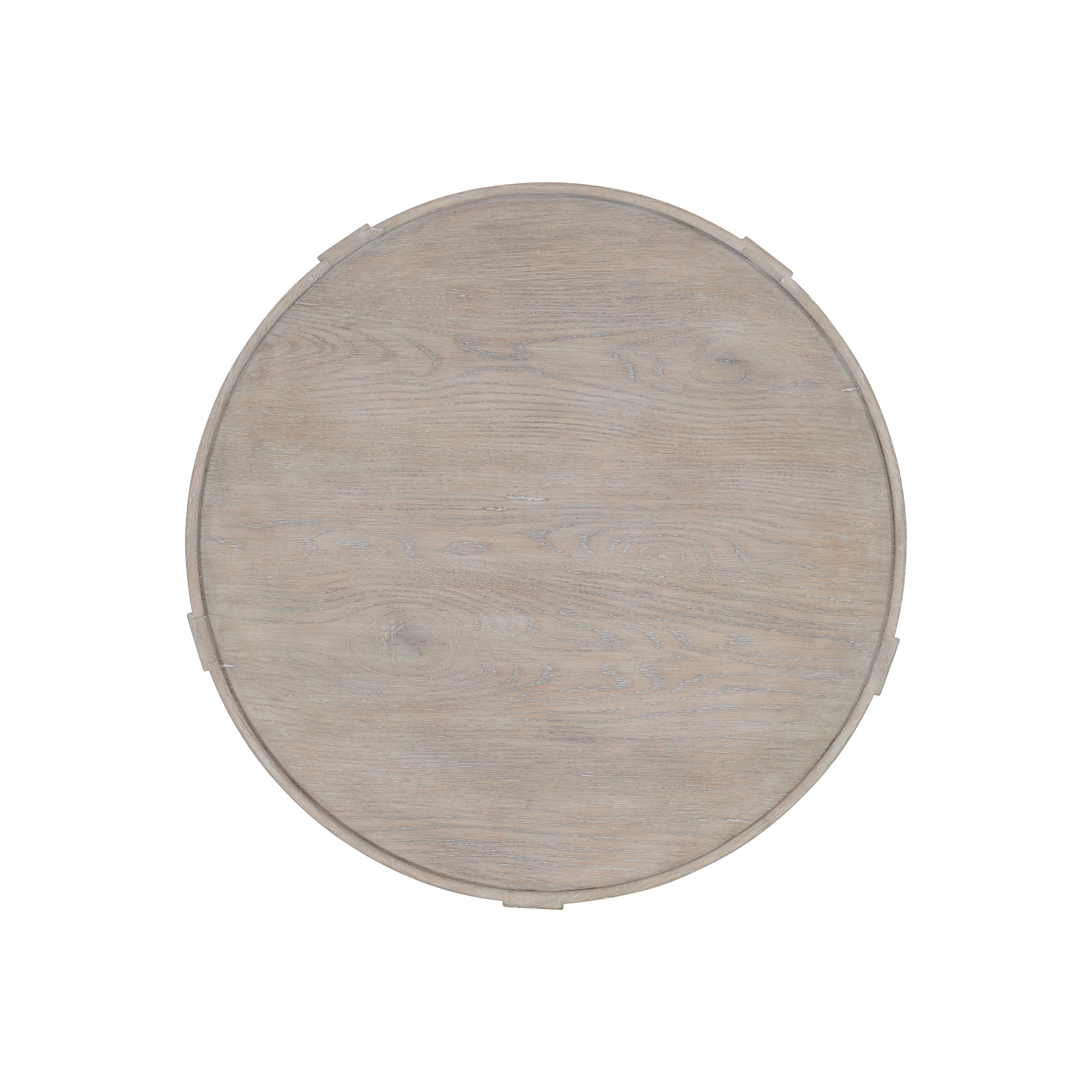 White oak solids and knotty white oak veneersPewter finish on the tableFeatures hexagonal shape with gallery top and decorative apronSix legsAdjustable glides