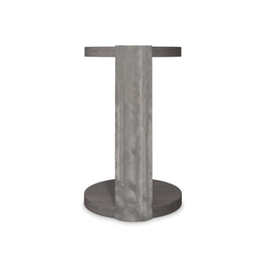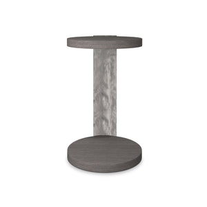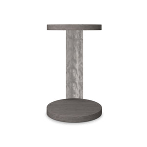 Round wood accent tableTop and base in Porcini finishCast aluminum back support post in Bright Graphite finishAdjustable glides