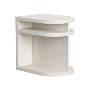 Ash solids and engineered veneer in Mist finishTable is rounded on one endOne shelf and bottom shelf surface are bisected by a center vertical partition dividing the shelves into halvesAdjustable glides
