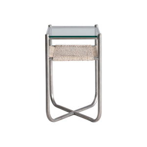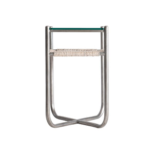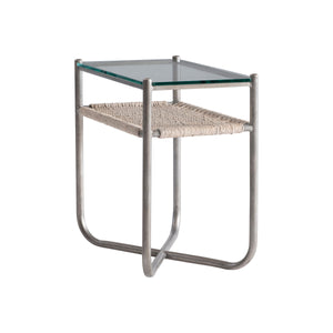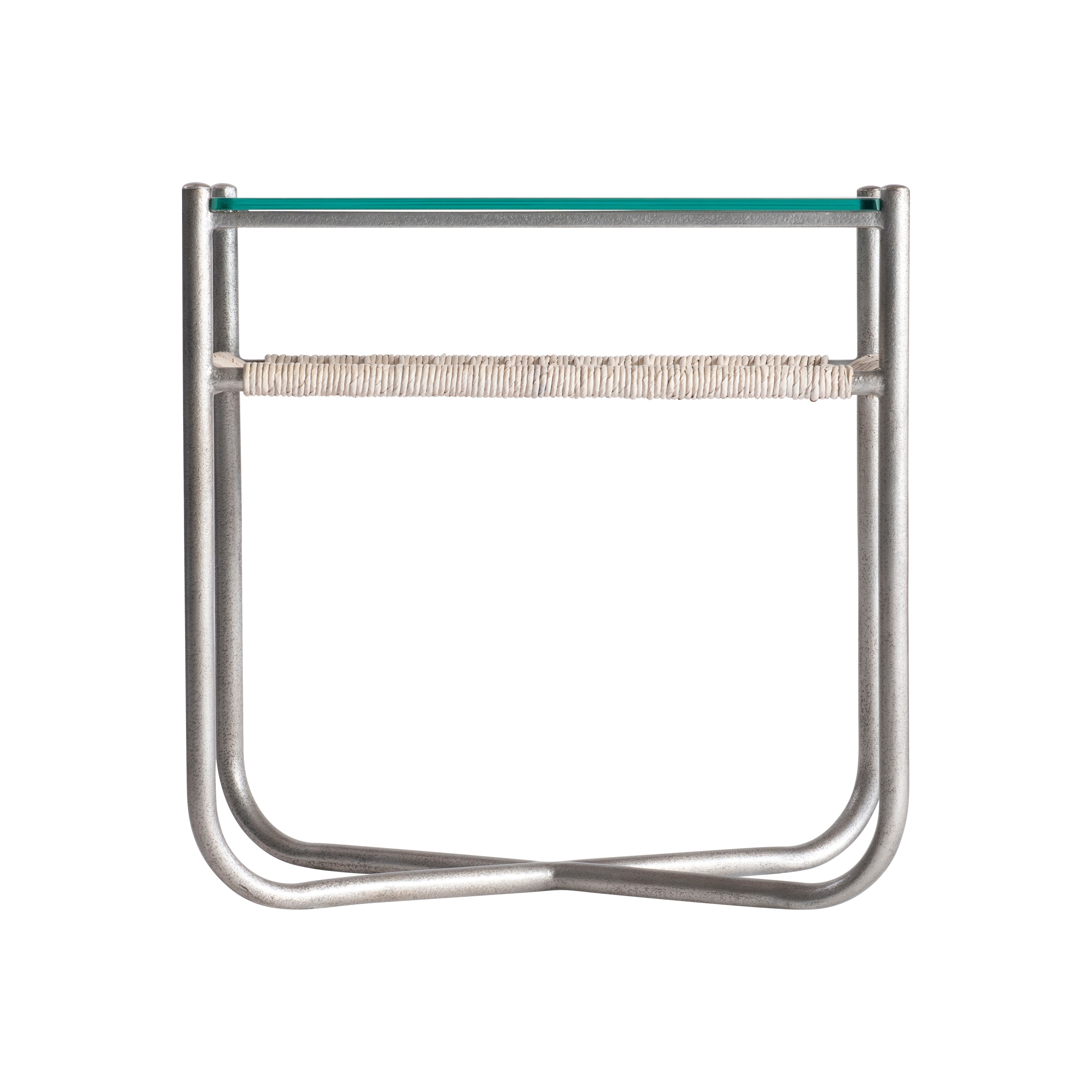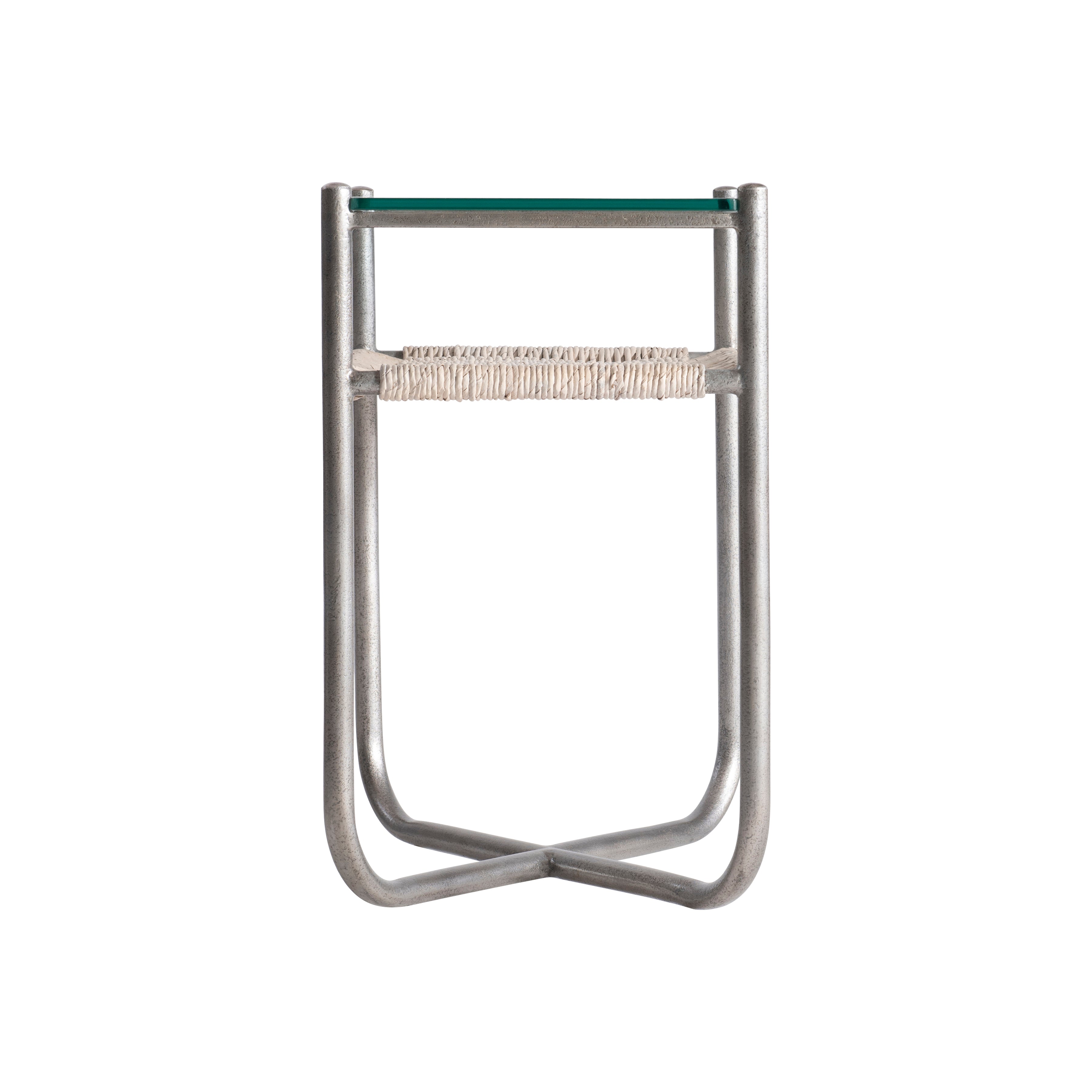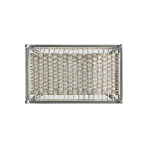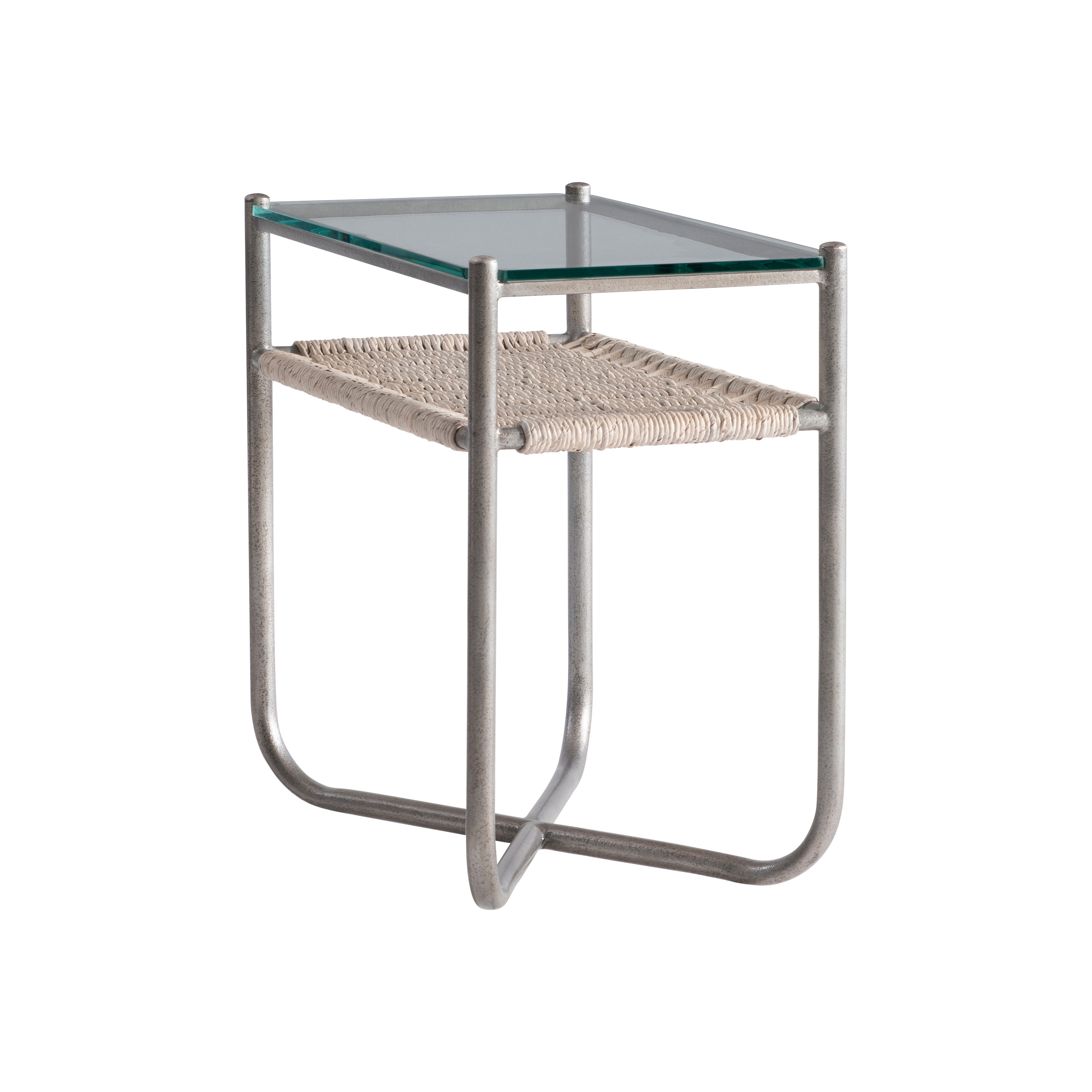 Steel frame in Graphite finish with woven abaca shelf in Light Grey Wash finish and a tempered glass top"X"-shaped bottom stretchersAdjustable glidesSpecifications subject to change without notice